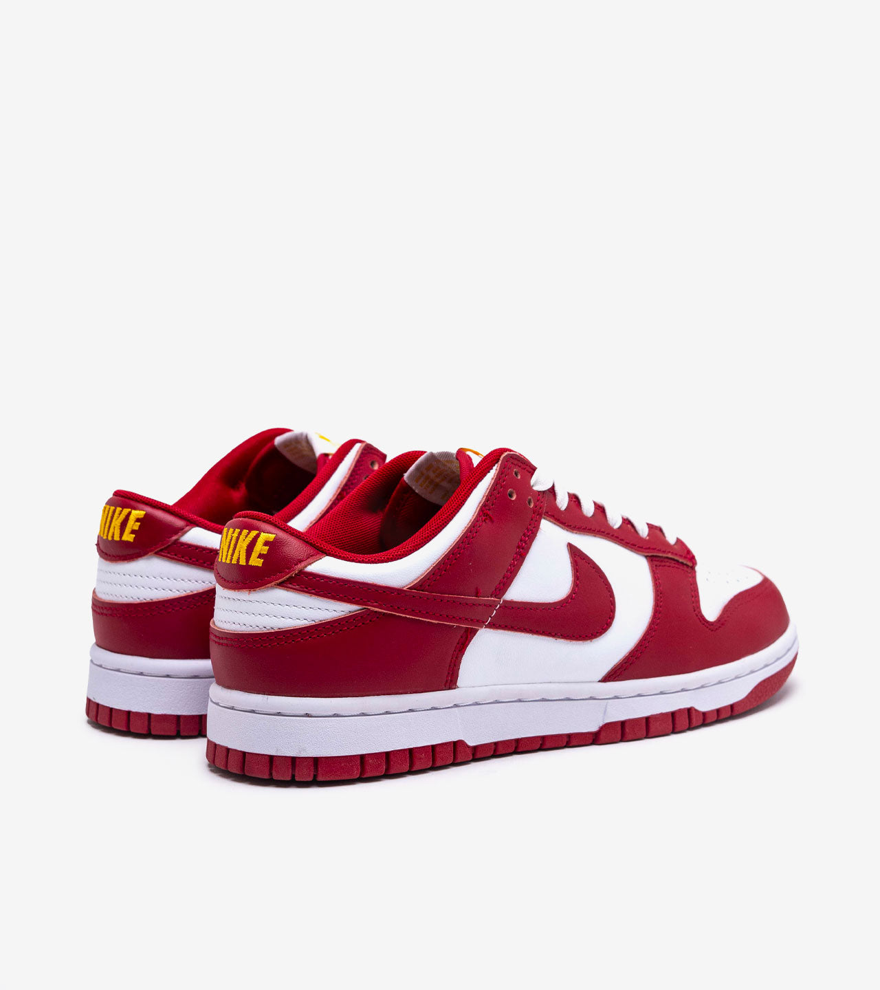 Nike Dunk Low USC — Cette déclinaison apporte une identité forte, conçue pour ceux qui recherchent une paire vraiment différente. La Nike Dunk Low USC s'inspire du monde universitaire américain, en particulier de l'Université de Caroline du Sud à Columbia. Elle arbore une empeigne en cuir blanc associée à des superpositions en cuir rouge, représentant les couleurs distinctives de USC. Pour ajouter une touche subtile, des éléments de branding sur la languette et le talon sont accentués en jaune, rappelant également la teinte présente sur les équipements des équipes de USC. SKU : DD1391-602 Date de sortie : Août 2022 Cette édition se distingue par une association de textures qui enrichit la profondeur du coloris. Les choix de proportions, la structure générale et les détails visuels ont été travaillés pour renforcer l’identité propre à ce coloris. La conception met en avant une proposition forte, idéale pour les amateurs de paires au design structuré. Chaque élément du design s’articule autour d’une cohérence esthétique qui fait de cette paire une proposition unique au sein de la collection. Un modèle capable d’apporter une touche distinctive à n’importe quel fit, tout en restant agréable à porter au quotidien.