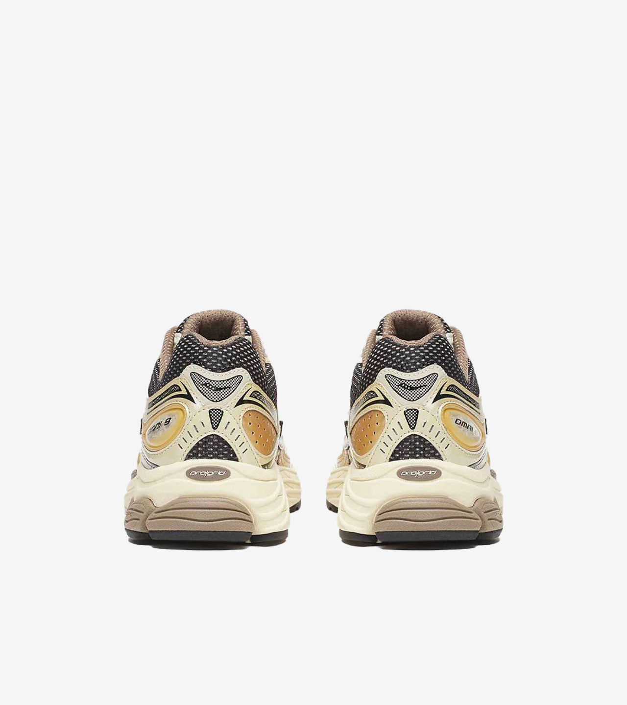 La Saucony ProGrid Omni 9 Gold est une sneaker rétro inspirée des running des années 2010, modernisée pour le lifestyle. Sa tige en mesh texturé combine des tons beiges / dorés (“gold”) avec des overlays synthétiques réfléchissants, ce qui apporte à la fois légèreté, stabilité et une esthétique technologique raffinée.