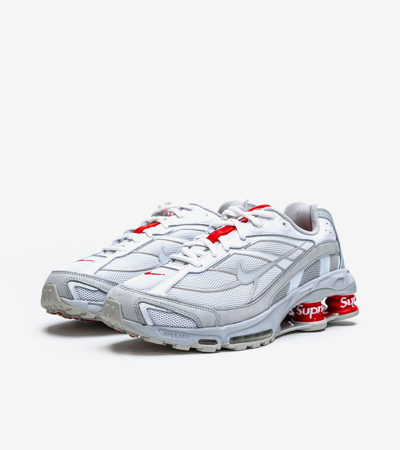 Nike Shox Ride 2 Supreme White — Ce modèle affirme une personnalité singulière, loin des codes habituels de la gamme. La Nike Shox Ride 2 Supreme White présente une base en mesh blanc avec différents empiècements en cuir, nubuck et TPU gris. Sa structure technique est complétée par divers éléments réfléchissants. Une unité Air Max soutient l'avant du pied, tandis que l'amorti Shox rouge complète l'arrière. Ces derniers arborent un branding Supreme blanc, apportant la touche finale à l'esthétique aérodynamique. SKU : DN1615-100 Cette édition se distingue par une silhouette revisitée pour accentuer sa présence visuelle. Les choix de proportions, la structure générale et les détails visuels ont été travaillés pour renforcer l’identité propre à ce coloris. La conception met en avant un rendu visuel affirmé qui s'intègre parfaitement dans une rotation streetwear pointue. Chaque élément du design s’articule autour d’une cohérence esthétique qui fait de cette paire une proposition unique au sein de la collection. Un modèle capable d’apporter une touche distinctive à n’importe quel fit, tout en restant agréable à porter au quotidien.